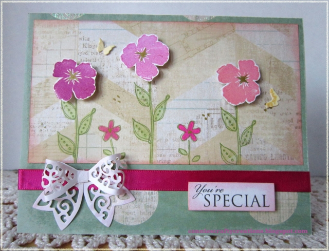 Very pretty! I like how the flowers are popped off the page. Love the paper bow and placement of the sentiment. Great job!
