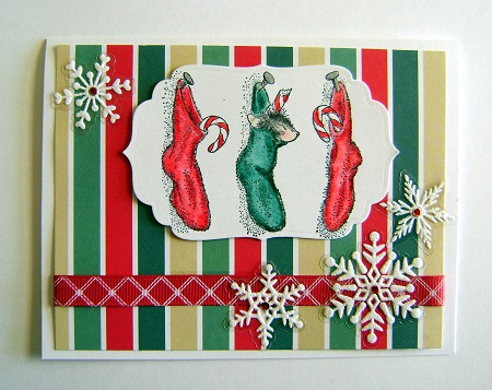 I just received this House Mouse stamp and it was so fitting for this month';s prompt with the candy canes in the stockings. I used striped pp also inspired by the stripes on the candy cane.