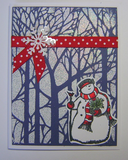 I had this tree background left over from last year. I used Versa mark ink through a stencil and added white sparkle ep and heat embossed. The snowman was colored and fussy cut. The snowflake is a sticker.