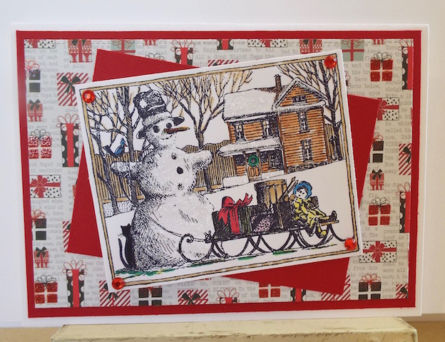 Colored image with Kaiser Craft Gel Pens. Applied Stickles to snowman and roof. Matted to red paper, then to patterned paper, then to white card base. Embellished with red gems. (Stamp Image - Impression Obsession) TFL