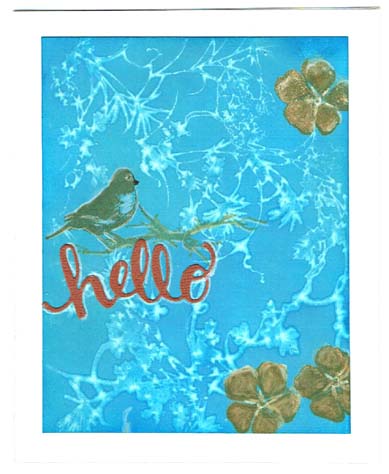 Water Stamping Background: Blend layers of strong bold DI colors across the card base. Apply distress embossing ink to background stamp. Mist lightly with water and stamp. Remove stamp immediately. Dry with heat gun. Stamp focal images with DI. Accent with white pencil.
