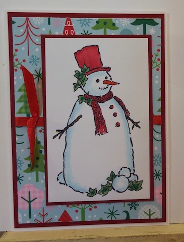 Another simple Christmas Card. Stamped image (Print Works), and adhered to background patterned paper that I found at a bargain price of ten cents a sheet. TFL