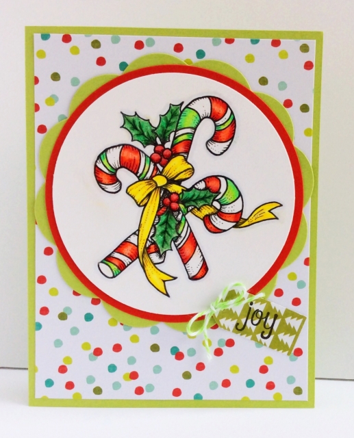 Supplies: Power Poppy Candy Cane digistamp, Hero Arts Joyful Christmas Season stamps, Versafine Ink, Prismacolor pencils, Heidi Swapp Marquee Love paper pad, EK Success tag punch, Spellbinders circle and scalloped circle dies, Gina K cardstocks