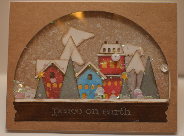 I marked where the bottom and edges of the snow globe was on the background and started to assemble the houses, trees, and mountains in that area. I then put double foam tape around the edges (did not do this very well since I can see some on the edges). I put some sequins and stampendous shaved ice in a little pile in the center of the houses and then put the globe which I had put a piece of acrylic behind over it.