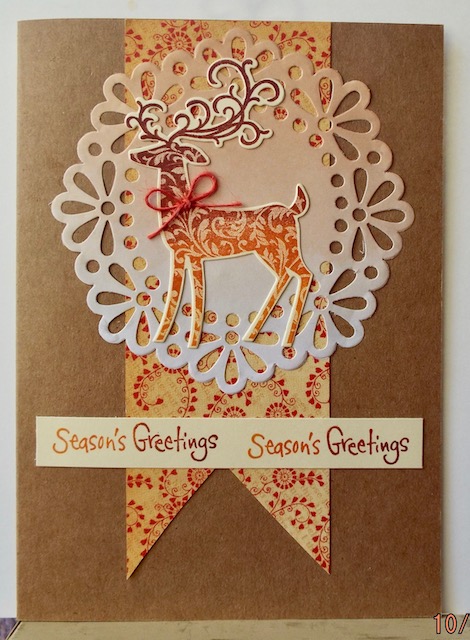 Stamped deer (Stampin' up) with Kaleidacolor ink. Stamped quote (Stampendous), and attached to doily and patterned paper, then to Kraft card base. TFL
