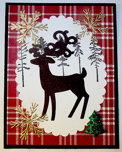 I gold embossed snowflakes over my deer die cut. Added trees to my background.