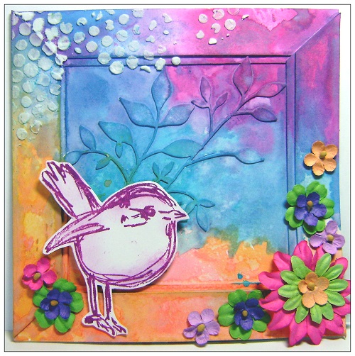 This is a very pretty card. I haven't seen the frame as part of the card before and like you, I really like the looks. Your colours rock. The bird is cute and I love the addition of the flowers.