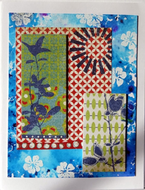 I tried to follow the sketch with my final 4 sheets from a 7 Gypsies paper pad. I was able to proportion my 3 sketch portions the same as the sketch but had to eliminate the cropped tails in order to accommodate the flower theme. The 2 smaller panels are popped up on fun foarm. I created a color burst background and heat embossed small white stamped flowers to carry out the theme.