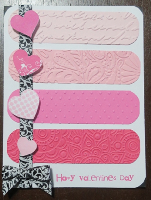 I did an ombre effect with the pink paper. I embossed each individually. The heart stamps are by Inkadinkado and Penny Black. I stamped them, fussy cut them and used foam squares to pop them up. The sentiment is by Studio G.