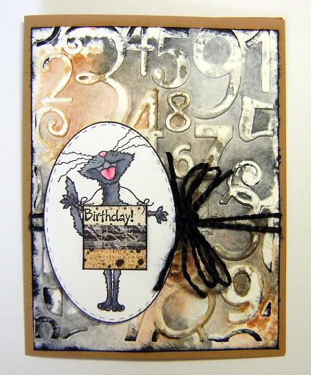 I combined two challenges with this card. For the EFink card I used a numbers embossing folder to do the technique. Connie, I did have some trouble too doing this and did about 4 backgrounds before I liked one! LOL! I wanted a grungy male birthday card. I am always in need of birthday cards.