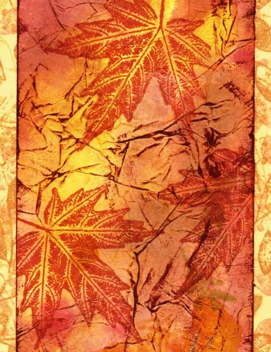 The card background was stamped with a leaf background stamp. I stamped a second image with the stamp inked in a different color and turned 180 degrees.