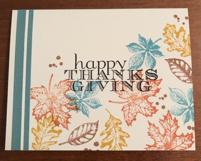 I have to admit I completely cased this card from one I had pinned on Pinterest! I like the Pinterest version better I think, but I did my best! I really like the colors and layout of the pinned card. I think my leaves are bigger so I had to stamp my sentiment in black for it to show up.