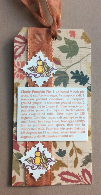The pumpkin/gourd images the recipe, pp and ribbon is from the kit. The only thing I supplied was the tag base and the distress inks that I used to watercolor the images. I don't think you can properly appreciate the patterned paper from the photo. It is some of the most lovely paper ever and it was all just itching to come together into this tag.