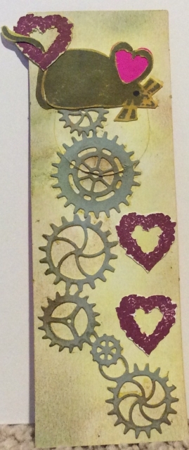 I fuusycut the hearts (stamped with StazOn) & applied all the elements to the base.