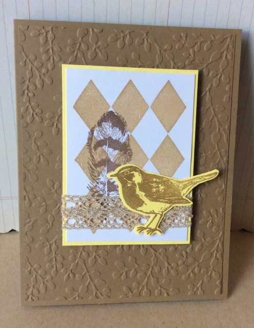 I used a Hero Arts Harlequin shadow stamp with Avery Elle pigment ink. I then stamped over it with my Gina K feather stamp with dark brown pigment ink. I added the fiber and bird over top.