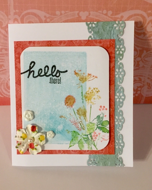 For my shadow stamp, I used the opposite side of a postcard stamp image from Lawn Fawn. I inked it up twice with a pale greenish blue pigment ink from Stampabilities. The wildflower image is from IBFS. I colored it with Tombow and distress markers and huffed on it. It's a little splotchy, I think I should have used more coloring in it! the flowers are from hobby lobby and michaels. TFl :)