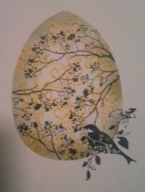 Placed the egg frame over & stamped the yellow design. Then stamped the branches. Finished by using ink & brush to add shading.