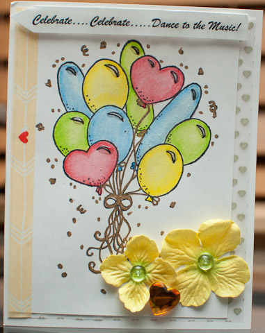 This is made from my kept kit. The balloon image which was colored with Inktense pencils, the flowers, the flower centers, and the heart jewel are all from the kept kit. The silver heart vellum is also from the kept kit. Party hearty card with hearts in the balloons and the jewel.