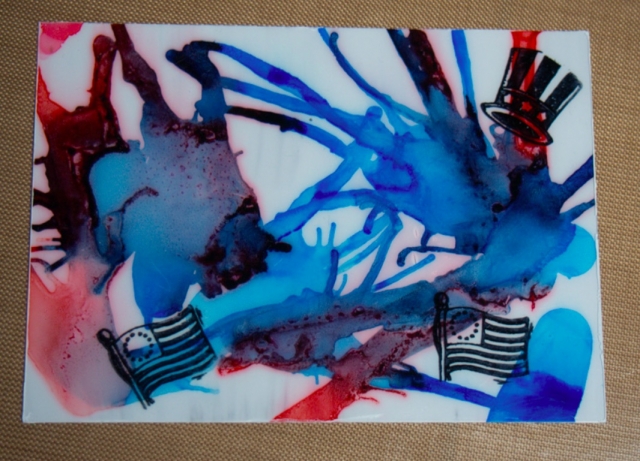 I decided I wanted to try the straw technique again on acetate for this ATC swap--to me the "sprays" look like fireworks. After I created the "fireworks", I stamped the hat and flag (Stampin Up) on the front using Stazon. I then coated the back with gesso to help the fireworks pop....I didn't realize that the red AI would bleed into the gesso, despite the AI was dry for probably a week! But I think it's still kinda cool looking.