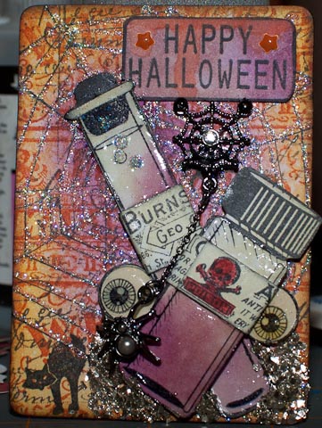 I stamped the medicine bottles, the Happy Halloween sign, and the eyeballs using the Inkadinkado test tubes stamp set. I colored them using Inktense pencils and then put glossy accents on the bottles and eyeballs. The labels on the bottles are from stampers anonymous apothecary stamp set.