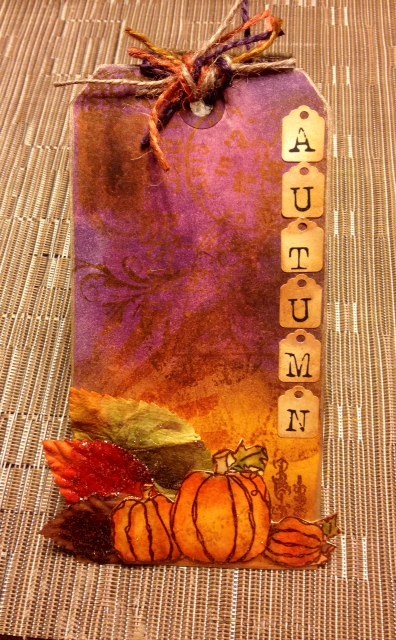 Started with a Manila tag, blended seedless preserves, dusty concord, wild honey, spiced marmalade and vintage photo distress inks on to it. I swiped tarnished brass distress stain along the edges of it. Stamped various images(almost all are from the stampers anonymous line) on to the tag using tea dye and vintage photo distress inks. Adhered letter stickers of the side of tag and added some tea dye DI to them. Embossed my pumpkin image(IBFS) on to watercolor paper and colored with distress markers and inks. Cut out and adhered to tag. Added some paper leaves(recollections) to bottom and added some distress stickles in tattered rose to them and the pumpkins. Attached some fiber to the top. TFL :)