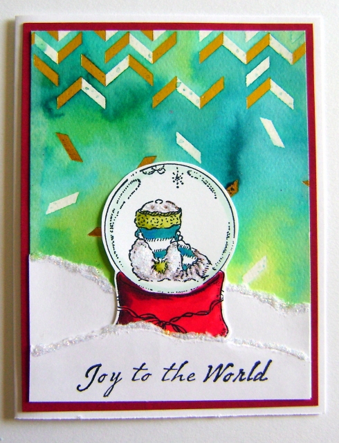 The background is resist watercolor paper that had designs on it. I used Color Bursts on it. The image was in my stash and again I don't know the company. I colored it with Spectrum Noir markers and fussy cut it. I tore white card stock for the snow banks and added Stickles glitter to them and to the snowman.