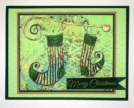 Your gelli print makes a terrific backdrop for those funky stockings! Love the hangar the stockings are on too. If you're not liking all of the green ... I wonder if you'd like it with white paint pen between the red stripes on the stockings? I would try it on a scrap first if you have one, to see if the paint picks up the color from underneath ... it still might look ok thought with green tinged stripes. Thanks for using both prompts! It is fantastic just the way it is.