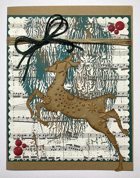 I made the background by applying a little acrylic paint on some music paper and then laying another piece of music paper on top. I then lifted off the paper and it left these streaks that remind me of fir tree limbs. The deer die is from Sizzix. I used a snowflake embossing folder on it from cuttlebug. I sponged the edges of the deer with brown ink to make him stand out more.