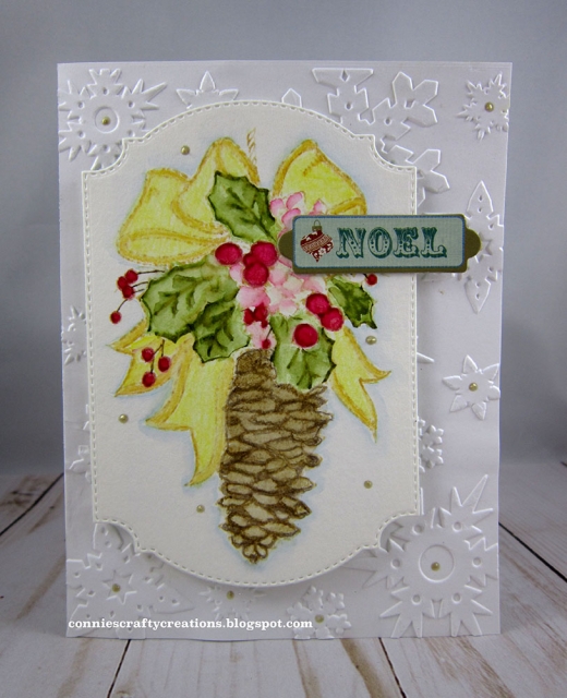 Stampendous - Pinecone decoration, stamped with Distress Antique linen, used Spectrum Aqua pencils to color