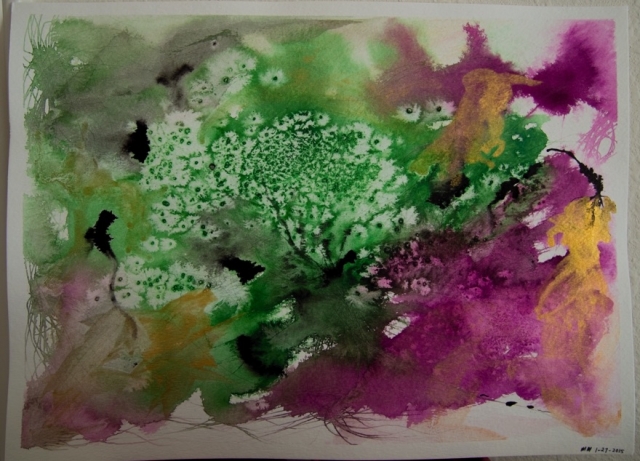 I used the Liquitex Inks, salt, bamboo skewer, and black india ink---all on watercolor paper. Next I am going to try this process on watercolor paper that I have painted with gesso first---that should be closer to the AquaBoard the artist used in the magazine in the process she instructed.