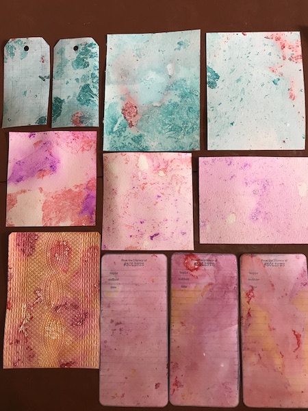 These are the pieces I made with the alcohol ink floating technique. The tags in the upper left were purchased at Hobby Lobby. The plain pieces are watercolor paper. The embossed piece was lying around after I tested a new embossing folder, so I floated that too! The 3 tags at the bottom were downloaded and printed from 30 Days of Lists. I will start a forum thread about 30 days of lists if anyone is interested.