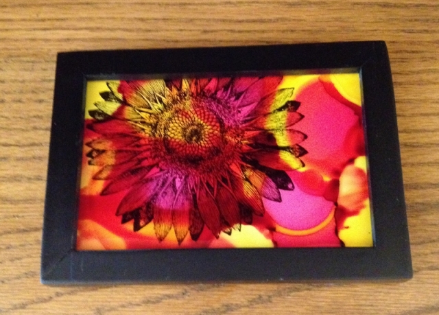 I had a crafty day with friends Saturday and one of them brought all of their alcohol inks and several items ready to ink. She bought frames at the thrift store, took the glass out and cleaned it, and let us play! I chose this black frame. I alcohol inked the glass, and put it back in the frame, ink side in. I stamped the big flower (SU sunflower) in archival ink on glossy white paper, and put it behind the glass. Tada! Ready for display! I'm thinking these would be fun to do for Christmas gifts.