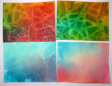 Here are my backgrounds. On the bottom 2 backgrounds I used all shimmer sprays. They were not intense enough to really show up. On the top 2 backgrounds I used regular dark color sprays and then I sprayed a white shimmer spray over them and then placed the plastic over it. That worked a lot better.