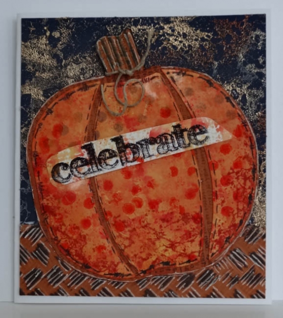 The light brown base of this distressed pumpkin is stamped with a print background. The pieced pumpkin top is created with a mix of alcohol inks and stamped images. The edges are completed with hand-drawn doodles. The stem is embossed with a crimper and inked.