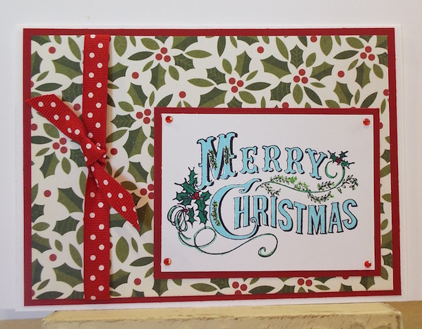I stamped the Merry Christmas image (Deep Red) I have not used yet, and colored with markers. I really wanted to color the quote in Red, however the evergreen in the letters M & C did not show up, so I ended up using blue. Am not sure about really liking the blue, but it worked. Adhered to patterned paper I have not used yet this year, and added the ribbon I have not used yet. Matted pieces to red CS, then to white card base. TFL