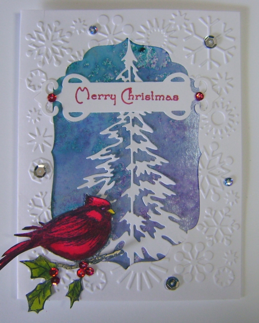 I used one of my backgrounds from the warm up challenge and cut a Christmas tree to add to it. The cardinal is an Inkadinkado stamp that I colored with Spectrum Noir markers. I fussy cut the image and adhered it to the front.