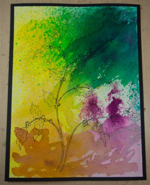 This is my doddle card I made. I used watercolor paper and sprayed with water then dropped a little Liquitex ink on the paper and then used a paintbrush to also spread the color around. I dried that layer with a heat gun and then used Dylusions inks sprays (blue and yellow). The colors mixed with each other. While they were wet I loaded my paint brush again with the Liquitiex ink (magenta color) and added that color to parts of the blue and thus made purple. Set all with heat gun.