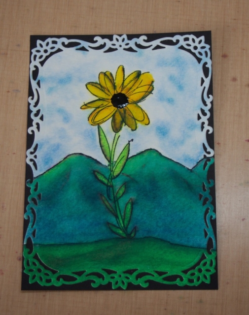 I used the watercolor pencils a twice allowing the paper to dry in between, I finally went over the mountains with chalk again and water and like the smooth result.
