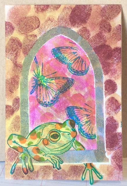 The froggie (IBFS) was fussycut & added by making cuts in the BG to insert him. His dots were done with (pencil) eraser-stamping.
