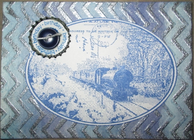 Here is the second faux patina piece. For the impression challenge, when I saw the picture, I knew I wanted to combo it with the faux patina and that I wanted to use this train stamp by Stampendous. It is actually a Christmas postcard stamp. But I knew it would be perfect because the train is in an oval, and the arch of the bridge in the picture with it's reflection created an oval. So I wanted to use an oval on the card. I used the bottle cap embellishment to cover the bit of holly from the stamp that overlapped the oval. The stamped sentiment actually has a flower at the center but since this is going to be a birthday card for my dad, I covered it with a button. I covered the sentiment with glossy accents and used that to attach the button. I colored the twine with silver ink.