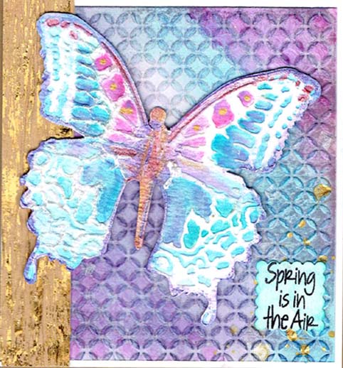The butterfly is a Tim Holtz die and stencil combo. Using a brayer I heat embossed the high embossed areas with clear embossing powder. And water colored wet-on-wet with distress inks. Accented with Pearl Paint, Inka Gold and Mica Gloss.