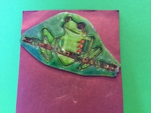 this was done by pressing the stamp into hot glue; then I colored it with permanent inks