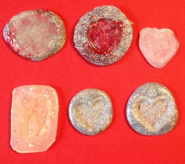 The red and silver heart has red glitter in it. I sprinkled red glitter on my non stick craft sheet, put a puddle of clear hot glue over it and impressed a heart. I should have left it alone! I had silver hot glue in my gun so I flipped the piece over and put silver glue over the back and sides.