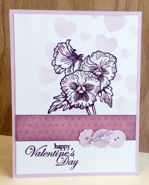 I used a Plaid Stencil and sponged milled lavender distress ink over the upper right corner. I then stamped the Pansy (I Brake for Stamps) over this in Versafine Imperial Purple. The Sentiment (Gina K Stately Flowers 5) was also stamped in the same ink.
