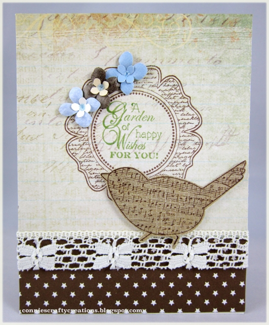 This card is beautiful. I really like the bird stamped in brown on the kraft. The blue flowers are a great accent.