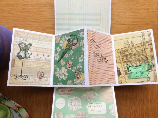 Here is the inside. I used more of my DIY shop papers and some sewing stamps that were free from a magazine.