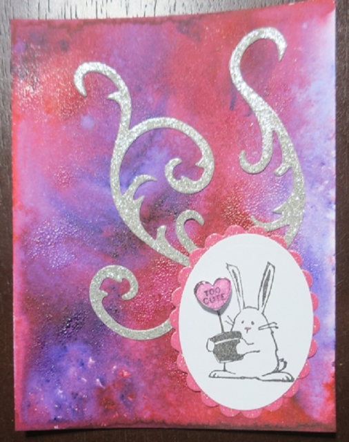 I used one of the color explosion backgrounds for the base. The bunny stamp is by Inkadinkado. I covered the heart with glossy accents, fussu cut it and used a foam square to pop it up. I used a TIm Holtz die to cut the flourishes out of glitter cardstock.