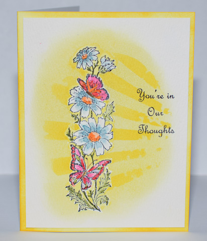That stencil is so perfect with the image. It looks like the rays of the sun shining on your flowers. Such a pretty card.
