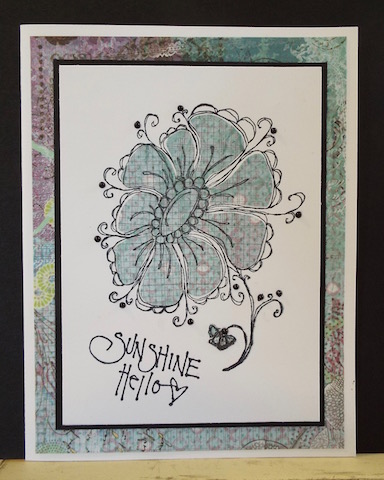 Stamped Images in black ink, and paper pieced flower using patterned paper. Matted to black CS, then to same patterned paper, then to white card base. Embellished with black adhesive faux pearls. Flower Image: Sunshine Designs. Quote: PrintWorks. TFL