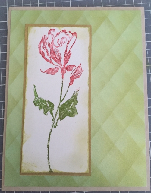 Here is my card. It is not completely finished yet. I want to add a few touches. The pillow was done on shimmery green paper inked with Shabby Shutters. The rose was also done with distress ink then mounted on shimmery gold paper and I inked the edges.